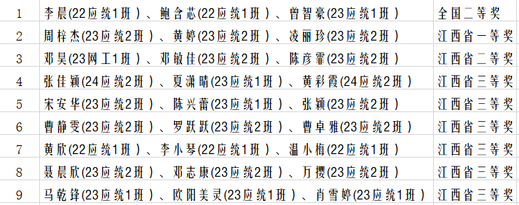 此次竞赛中,我校参赛队员们带着学院的殷切期望,凭借扎实的专业基础、顽强的拼搏精神,在74小时的昼夜奋战中默契配合、攻坚克难、勇于创新,从分析问题、构建模型,到数据处理、撰写论文,每一个环节都凝聚着团队的智慧与汗水。最终,经过激烈角逐,我校学子不负众望,斩获全国二等奖1项;江西省一等奖1项、二等奖1项、三等奖6项,共计9项大奖,较往年成绩实现稳步提升,再创历史佳绩!具体获奖同学名单如下: