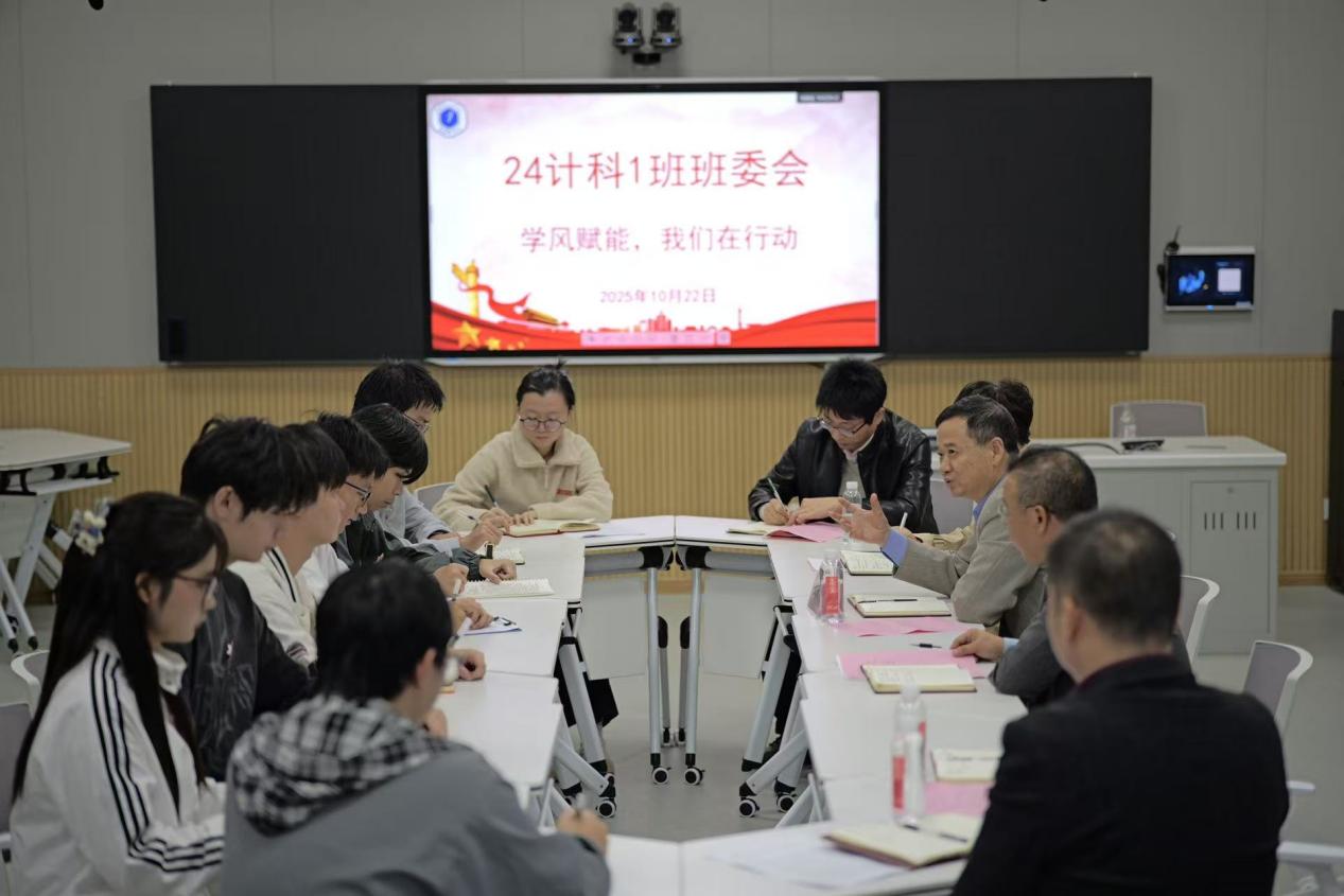 (本网讯:文:罗之璇|图:刘嘉楷)2025年10月22日,校党委副书记、校长熊振宇深入24计科1班,出席“学风赋能,我们在行动”专题班委会,与班级班委共同探讨班级学风建设工作。学院领导班子全体成员、带班辅导员、学业导师共同参加。