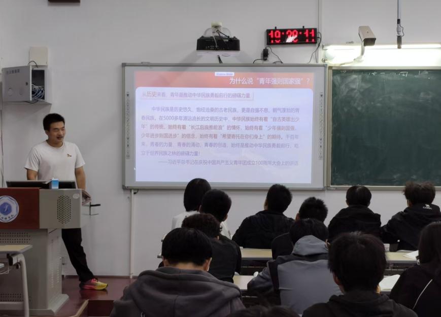 金哲源进行理论宣讲 高梅摄 在理论讲解部分,宣讲团成员以深入学习贯彻党的二十大精神为引,结合习近平总书记对青年的殷切期望,以青年化的语言和视角,阐述了新时代好青年应具备的“有理想、敢担当、能吃苦、肯奋斗”的优秀品质。宣讲团成员还从历史、当下和未来三个维度,阐述了“青年强则国家强”的深刻内涵,带领新生深入学习青年榜样精神,从中共一大青年革命者的敢为人先精神,到航天报国的嫦娥团队、神舟团队科学创新精神,再到扎根乡村振兴和社会服务的基层服务青年工作者的奉献精神。