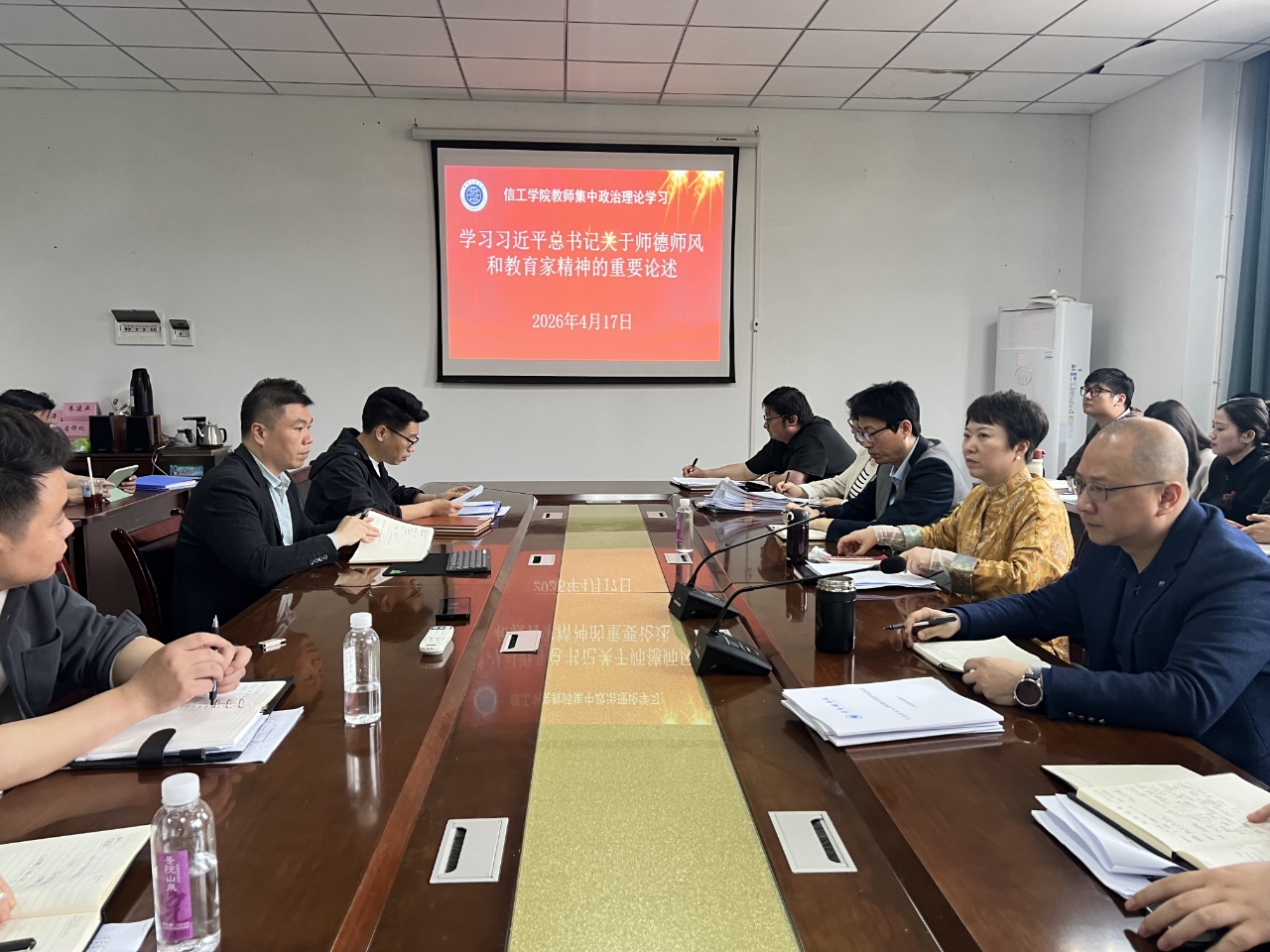 会上,全体参会人员一起学习了习近平总书记关于师德师风的重要论述和关于弘扬教育家精神的重要指示、《江西省高校教师师德失范行为处理实施办法》,同时通报了师德失范警示教育案例,引导全体教师以案为鉴,警钟长鸣。随后,练缤艳传达了《景德镇学院2026年教师思想政治和师德师风建设工作要点》《景德镇学院2026年教师培养培训工作方案》,并部署了信息工程学院2026年教师培养培训及师德师风建设工作。紧接着教师代表夏辉和刘书琴结合工作实际作交流发言。