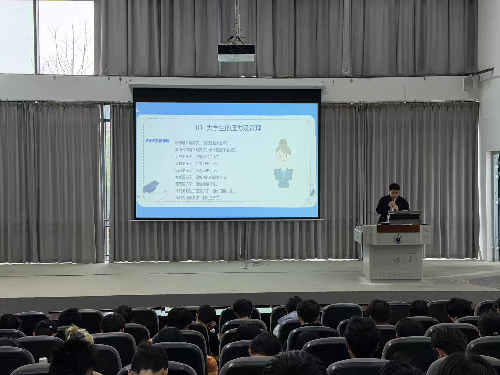 讲座中,李乐围绕大学生压力管理与挫折应对两大核心内容展开讲解。他结合当下社会现象与真实案例,引导同学们正确认识压力,分析大学生在学业、生活、人际、就业等方面的常见压力来源,并针对农村生源、家庭经济困难学生、不同年级学生的压力特点进行细致解读,帮助大家看清压力、读懂压力。