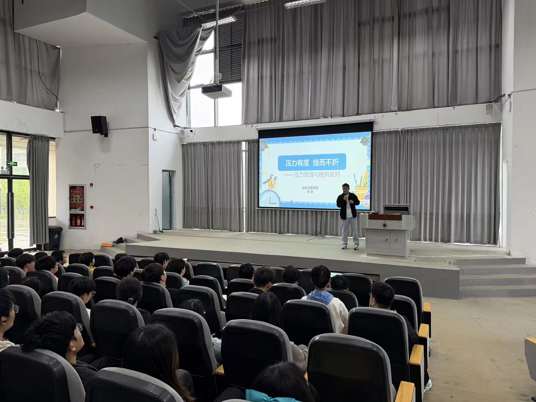 (本网讯:纪李昊慧/图|文:纪李昊慧)为深入落实学校 “润心励志” 助学行动要求,切实加强对家庭经济困难学生的心理关怀与成长支持,引导学生科学管理压力、理性面对挫折,近日,信息工程学院面向家庭经济困难学生开展“压力有度·挫而不折 —— 压力管理与挫折应对”心理健康专题讲座。本次讲座由学院李乐老师主讲,学院相关学生到场参加。