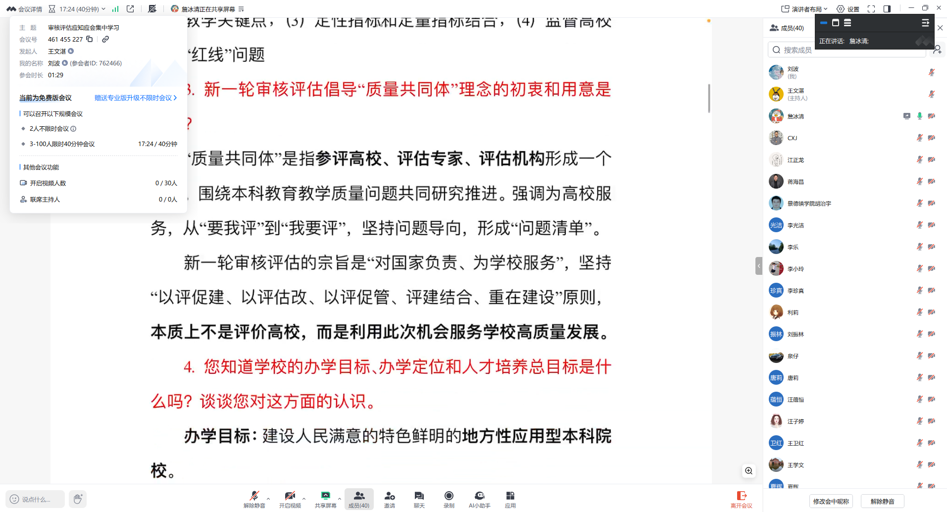 2025年9月29日晚19点30分,信息工程学院于线上召开了审核评估应知应会手册集中学习会议,此次会议由信工学院应用统计系主任詹冰清主讲,有四十余名教师参与了此次学习。
