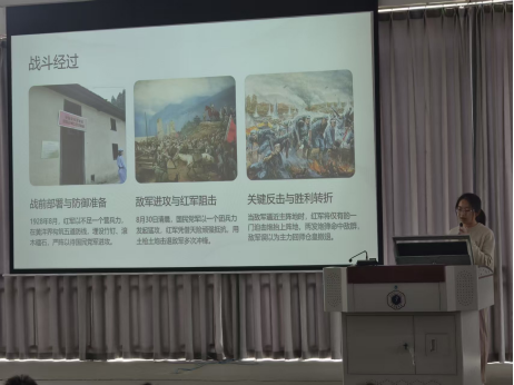 随后,选手依次登台,围绕红色人物、革命历史、红色地标等主题,逐一讲解自己的AIGC创意作品。选手们结合专业所学,通过智能生成、创意设计、内容演绎等形式,将厚重的红色文化与前沿技术深度融合,作品主题鲜明、形式新颖、感染力十足,充分展现了信工学子的创新思维与家国情怀,赢得台下阵阵掌声。