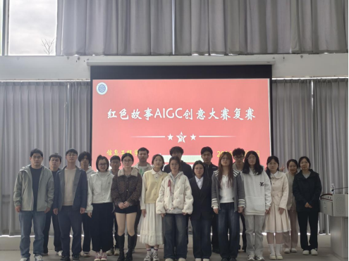 活动最后,到场老师与全体参赛选手合影留念,镜头定格下青春与红色、技术与情怀交融的美好瞬间,为本次红色故事AIGC创意大赛画上圆满句号。