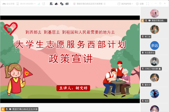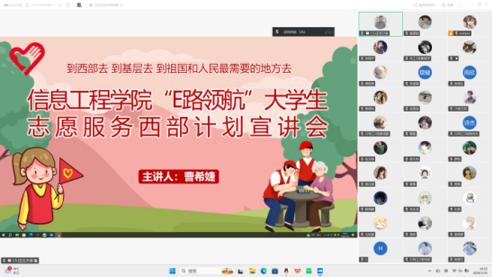 (本网讯:纪李昊慧/图:巢嘉铖/文:金哲源)为引导毕业生树立正确的就业观,拓宽基层就业渠道,鼓励青年学子投身基层、服务国家,4月8日,信息工程学院线上举办西部计划主题宣讲会。本次宣讲会由辅导员曹希婕、胡文婷主讲,学院2025届西部计划志愿者张志鹏应邀分享经验,26届毕业班学生积极参与。